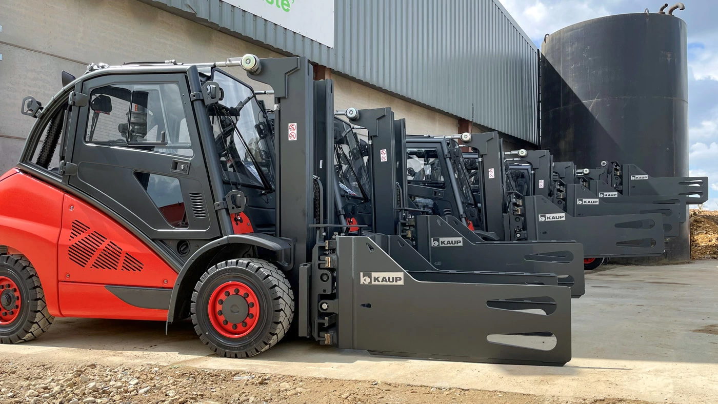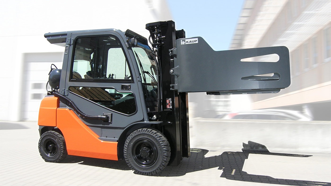 Whether in recycling or the paper industry, transporting non-palletised goods requires different forklift attachments. KAUP’s wide range of special clamps ensures the right solution for every material handling task. All clamps share a strong, view-optimized T- and C-profile design, differing only in load capacity and width, with the option to combine with rotary units if needed.