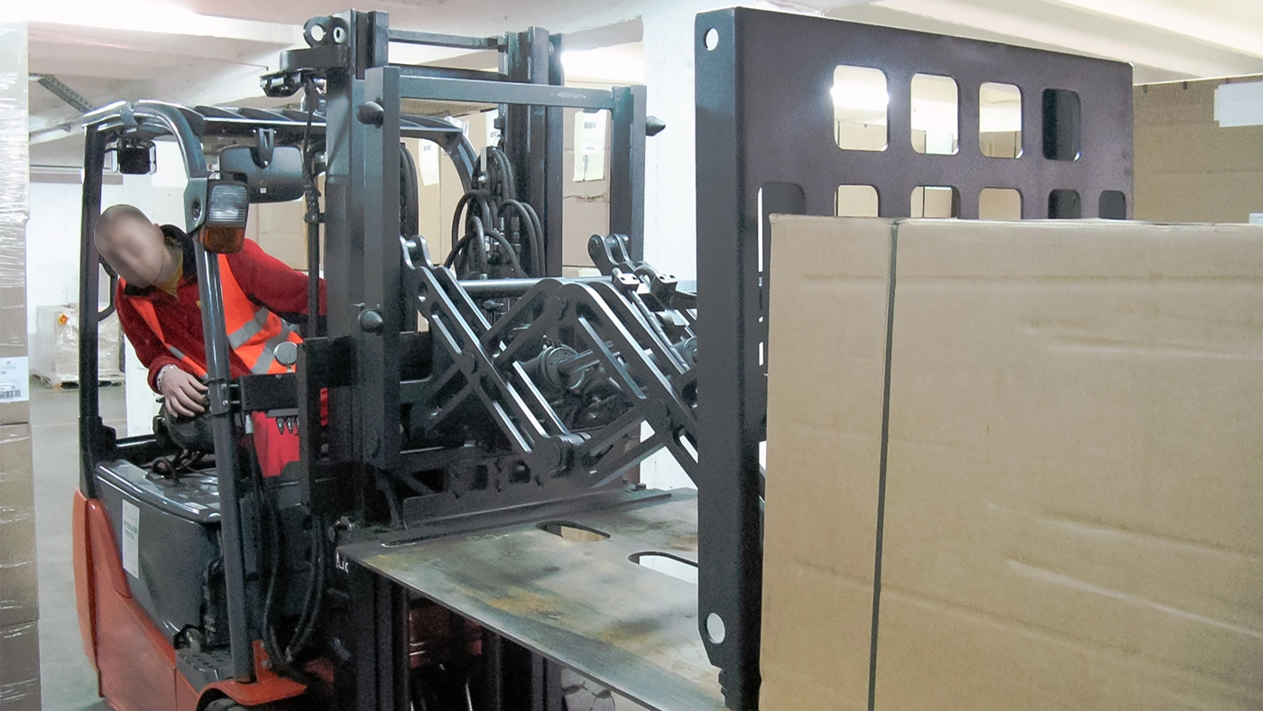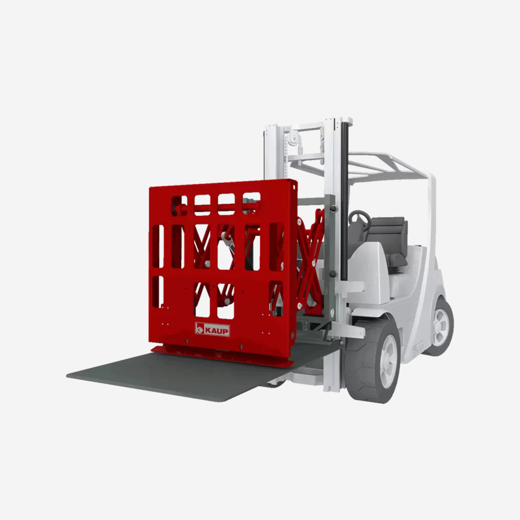 KAUP Push-Pulls are a part of the KAUP Pusher range of products. They enable transportation of loads with inexpensive and place saving slip-sheets which are usually made of plastic or cardboard. This KAUP attachment makes expensive and unwieldy wooden pallets superfluous and optimal economical loading of overseas containers possible.
